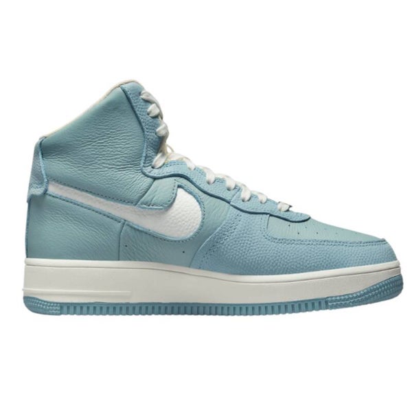 🇬🇧 The Air Force 1 High Sculpt is dressed in an Ocean Cube, Summit White, and Worn Blue color scheme. This strapless edition of the Nike Air Force 1 High features a blue tumbled leather upper with white cutout Swooshes on the sides. White tongues, laces, lining, and midsole atop a blue rubber outsole complete the design.