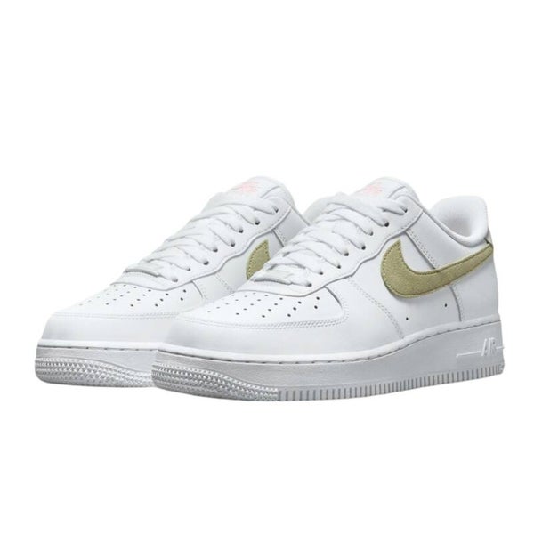 🇬🇧 This version of the Nike Air Force 1 Low features an all-white leather upper with perforated toe cap and side panels. An olive suede Swoosh, pink accents on the tongues, heels, and insoles, and a solid white AF1 rubber outsole complete the design.