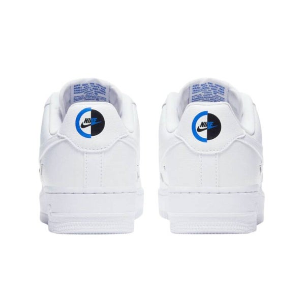 🇬🇧 Dressed in a white, hyper royal, and black color scheme, this version of the Nike Air Force 1 Low features a clean, traditional white tumbled leather upper, accented with a total of eight chrome Swooshes—four on each side panel. Blue branding on the tongue and heels, along with a graphic sockliner, completes the design.