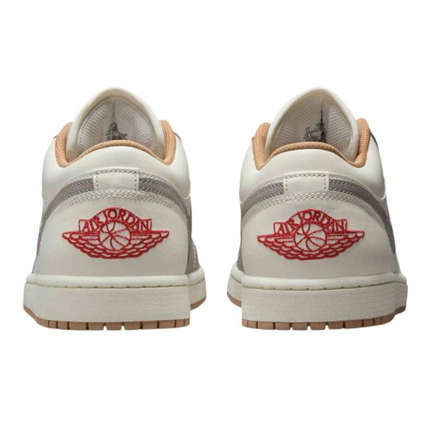 🇬🇧 The Swoosh, toecap, and eyelet stripe are in "College Grey," while the rest of the upper favors a simple "Sail/Pale Ivory" leather. Unlike the model's more common color blocking, the lining and outsole opt for a khaki "Hemp" hue. A small but impactful "Fire Red" accent plays a key role on the Jumpman logo on the tongue and the Wings logo on the heel.