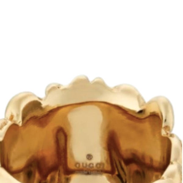 Questo anello Gucci a forma di testa di leone è uno dei design più audaci e riconoscibili della maison. Realizzato in metallo finitura oro anticato, raffigura un leone scolpito con grande attenzione ai dettagli, che stringe tra le fauci una pietra verde intensa dall’effetto jewel. Un accessorio dal forte impatto visivo, simbolo di forza e carattere, perfetto per chi ama distinguersi con un’estetica decisa e luxury. Indossato, diventa immediatamente il protagonista del look. Nuovo con etichette. Articolo introvabile.